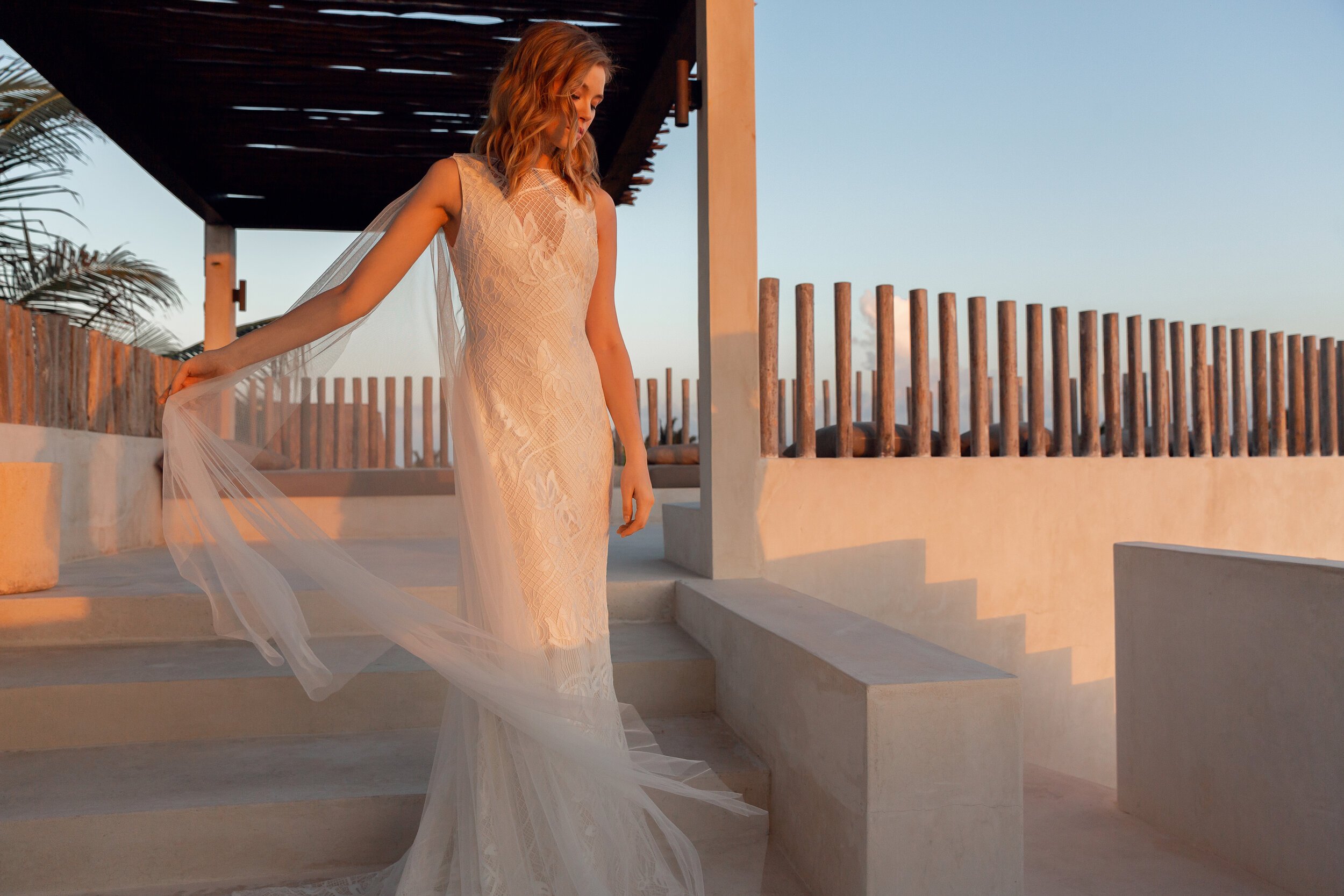 All over beaded sheath, mermaid, Ariana by Flora bridal.