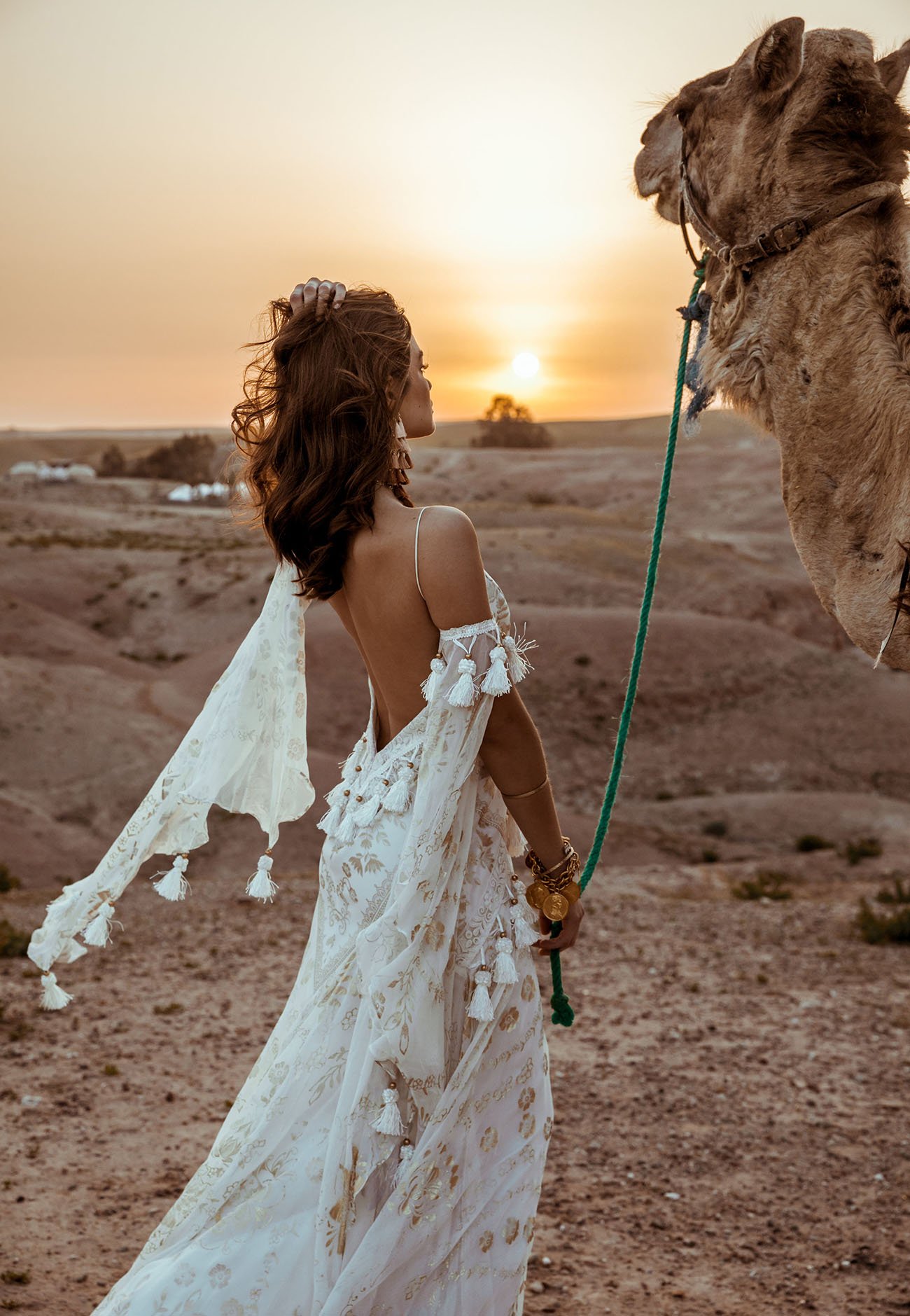 Let the light catch the intricate gold foil patterns overlaid on the silk fabric to showcase your shining wedding day joy. Beaded tassels add a unique boho vibe. The bodice is fitted to flatter your waistline and the backless style draws attention to the tassels. The full and floaty handkerchief hem has a generous train that can be bustled for when it's time to dance.